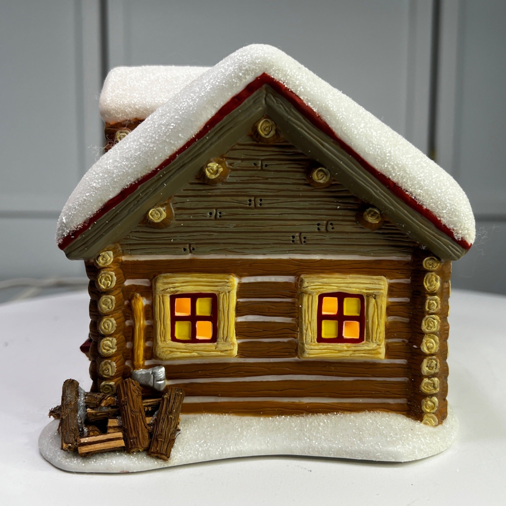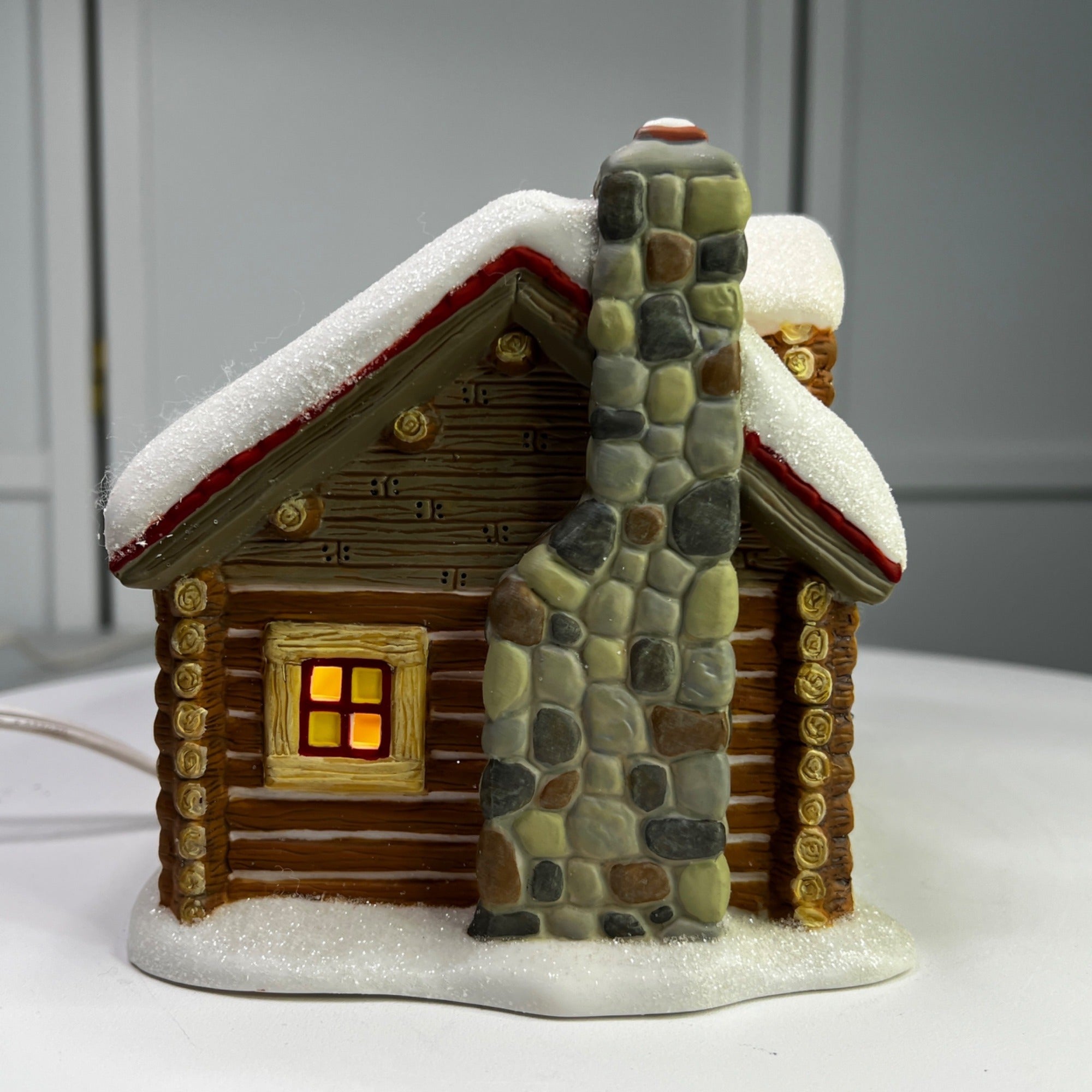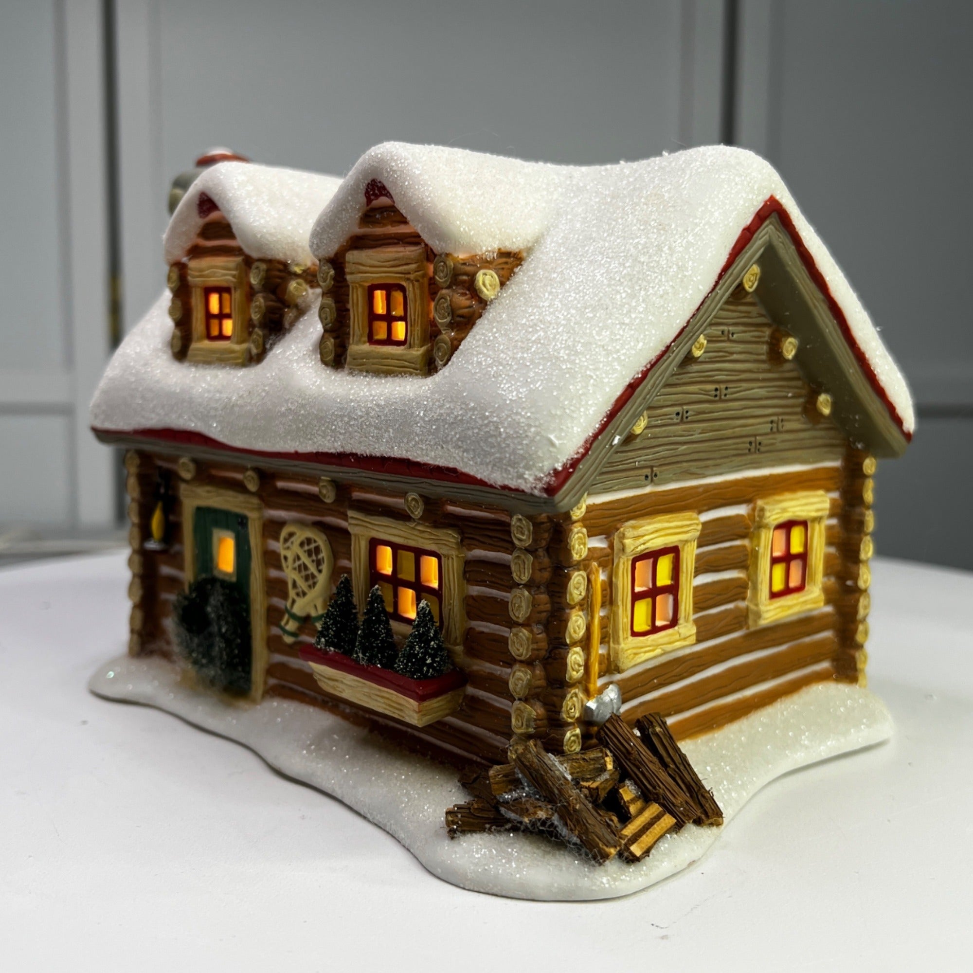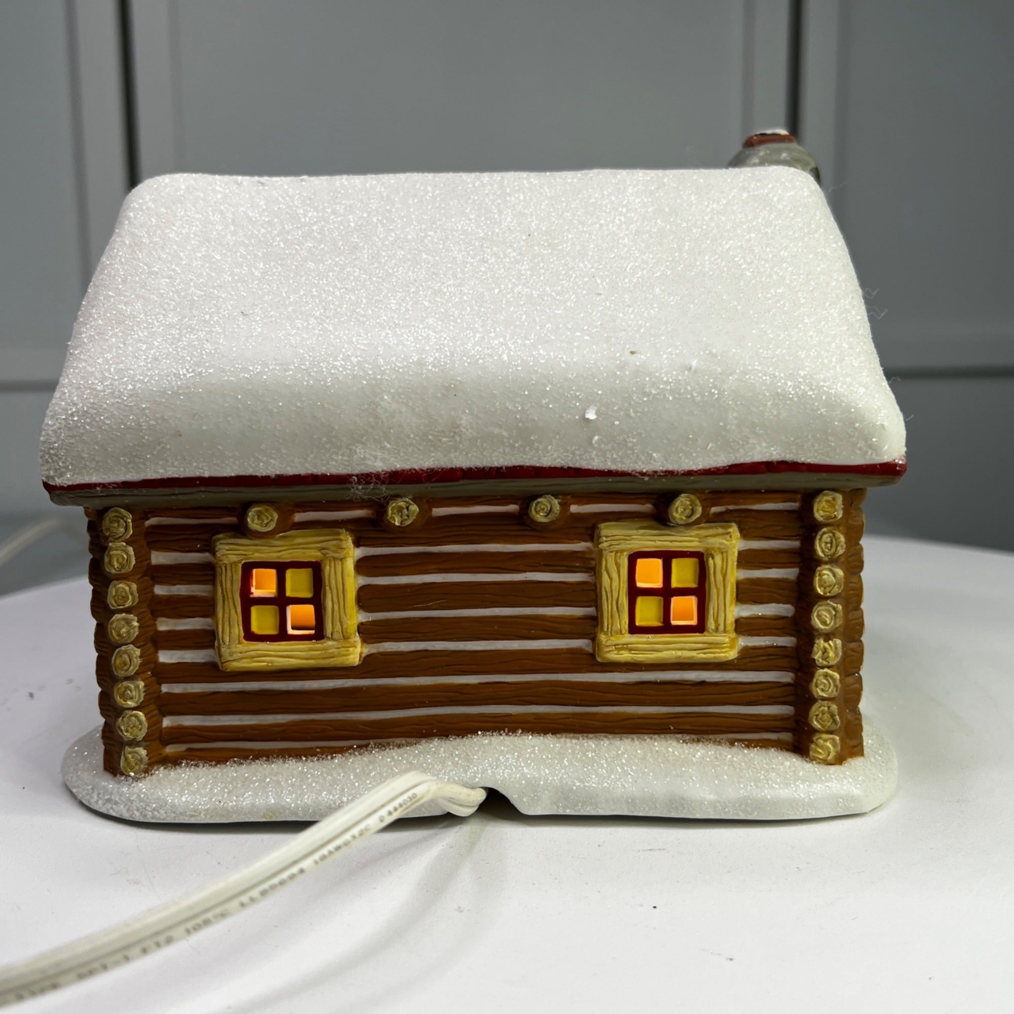 Department 56 Snowshoe Cabin, Pine Isles Christmas Village lighted building from 1996. Beautiful hand painted porcelain building. This traditional-style log cabin features a whimsical design with glitter snow accents and illumination, making it a charming addition to any holiday display. The Snowshoe Cabin looks beautiful when lit. Size: 6 ¼" by 5 ¼" by 5".