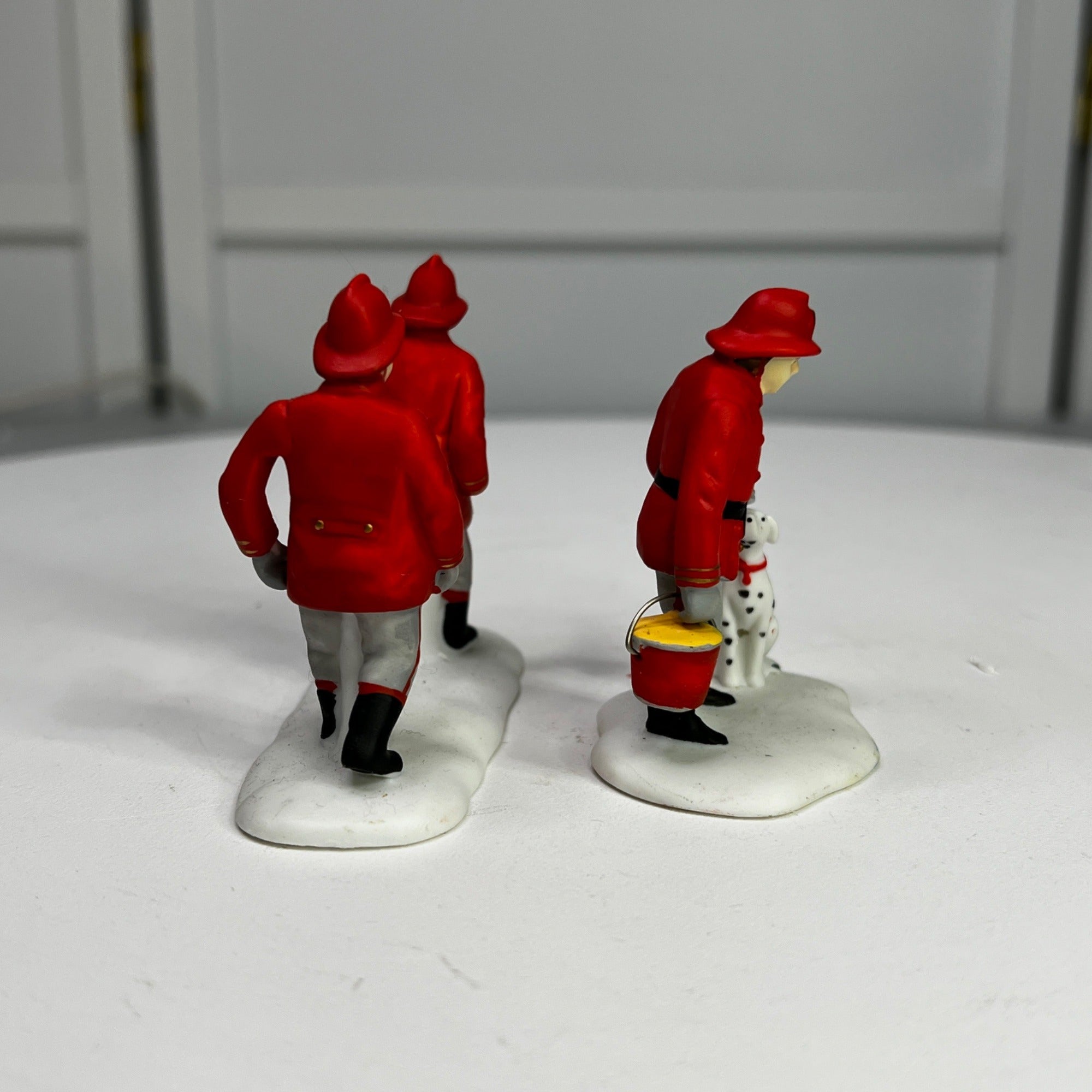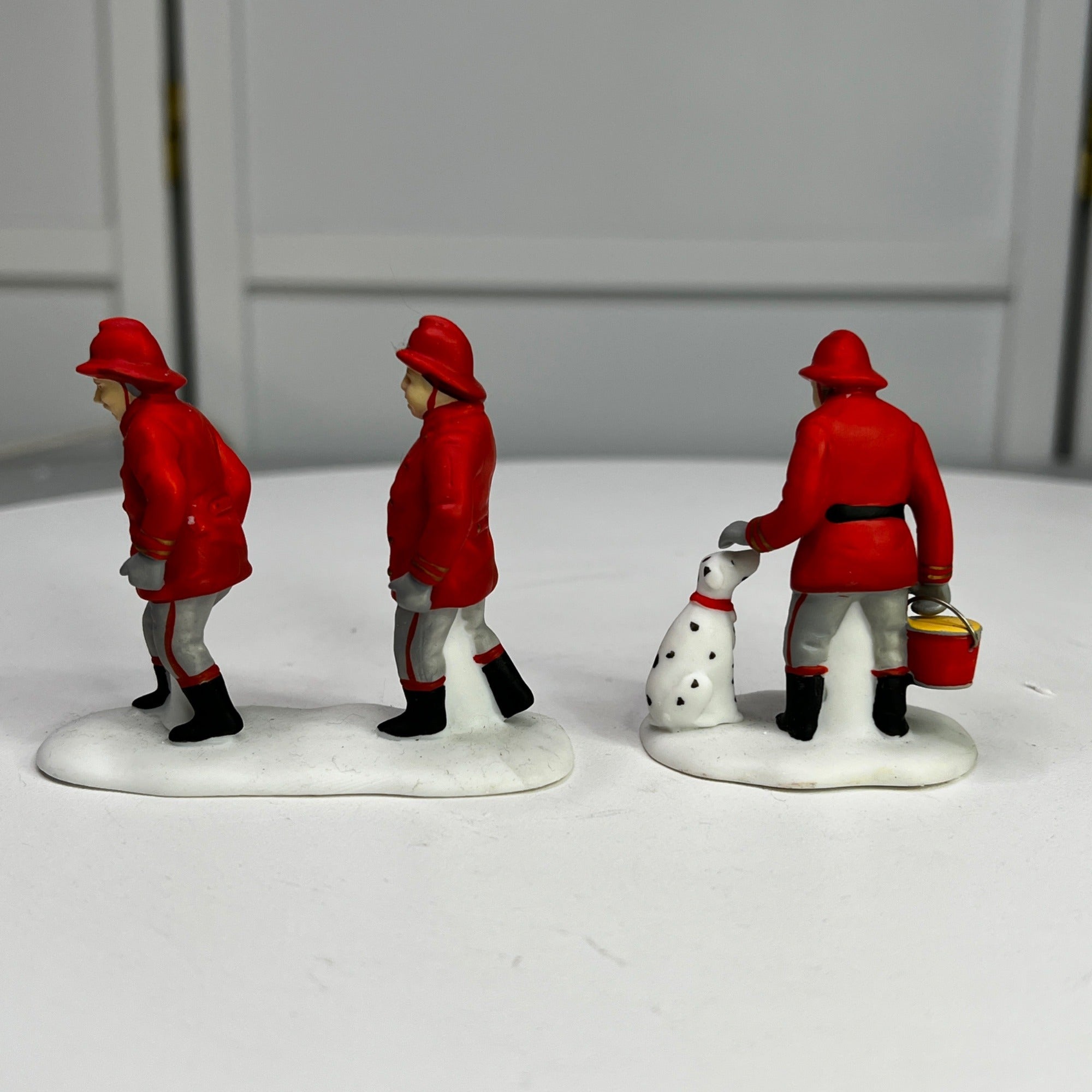 Department 56 The Fire Brigade, Christmas In The City Village accessory, set of 2 from 1991. 3 firemen in two pieces. Two of the firemen used to carry a ladder (ladder is missing) and the last firemen is carrying a bucket with a Dalmatian by his side. Size: 2.25" Tall.