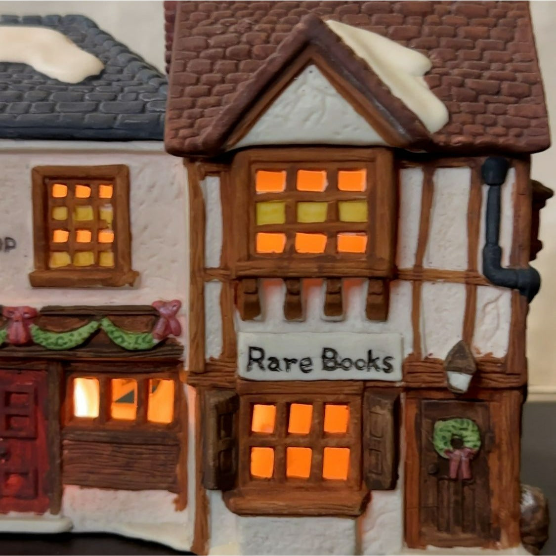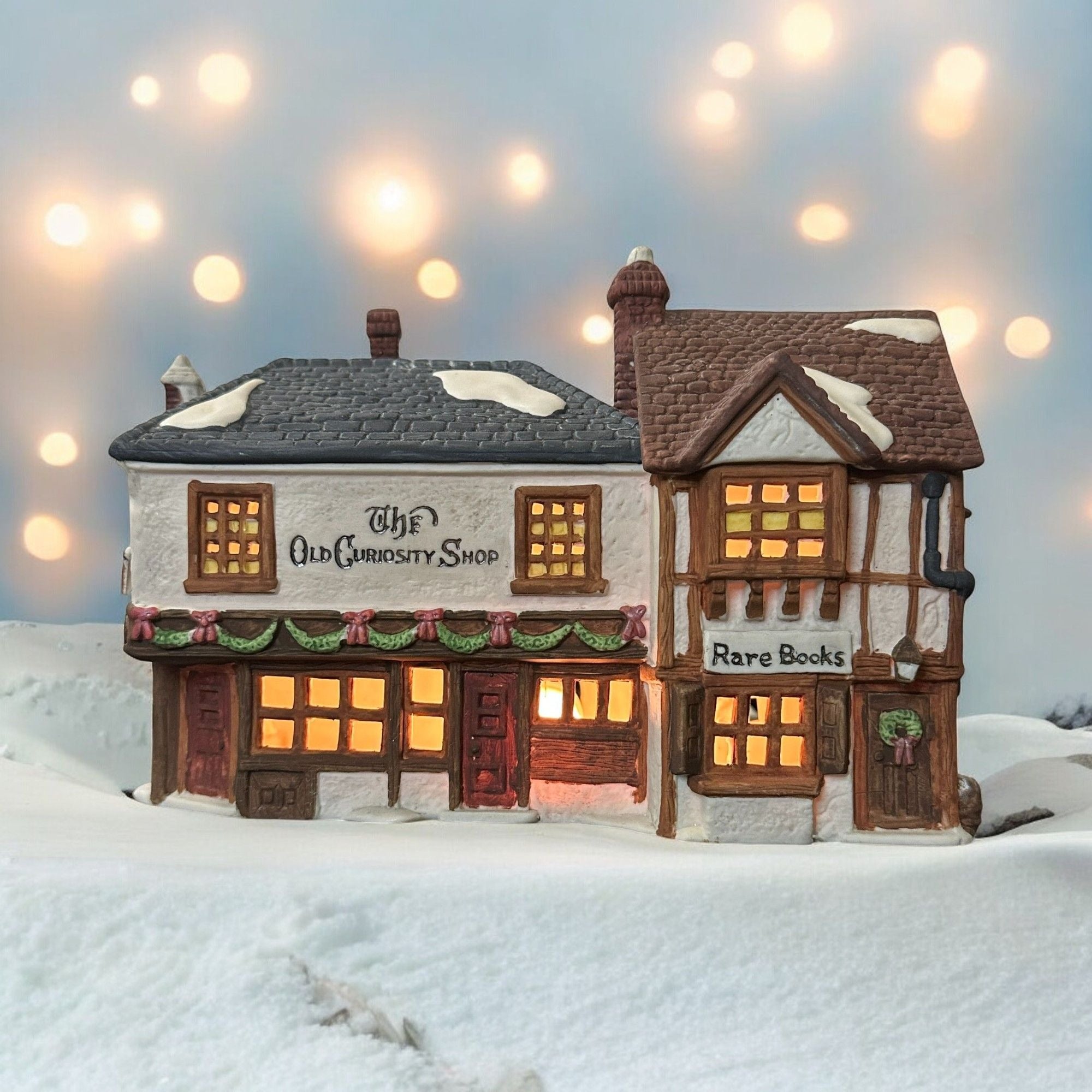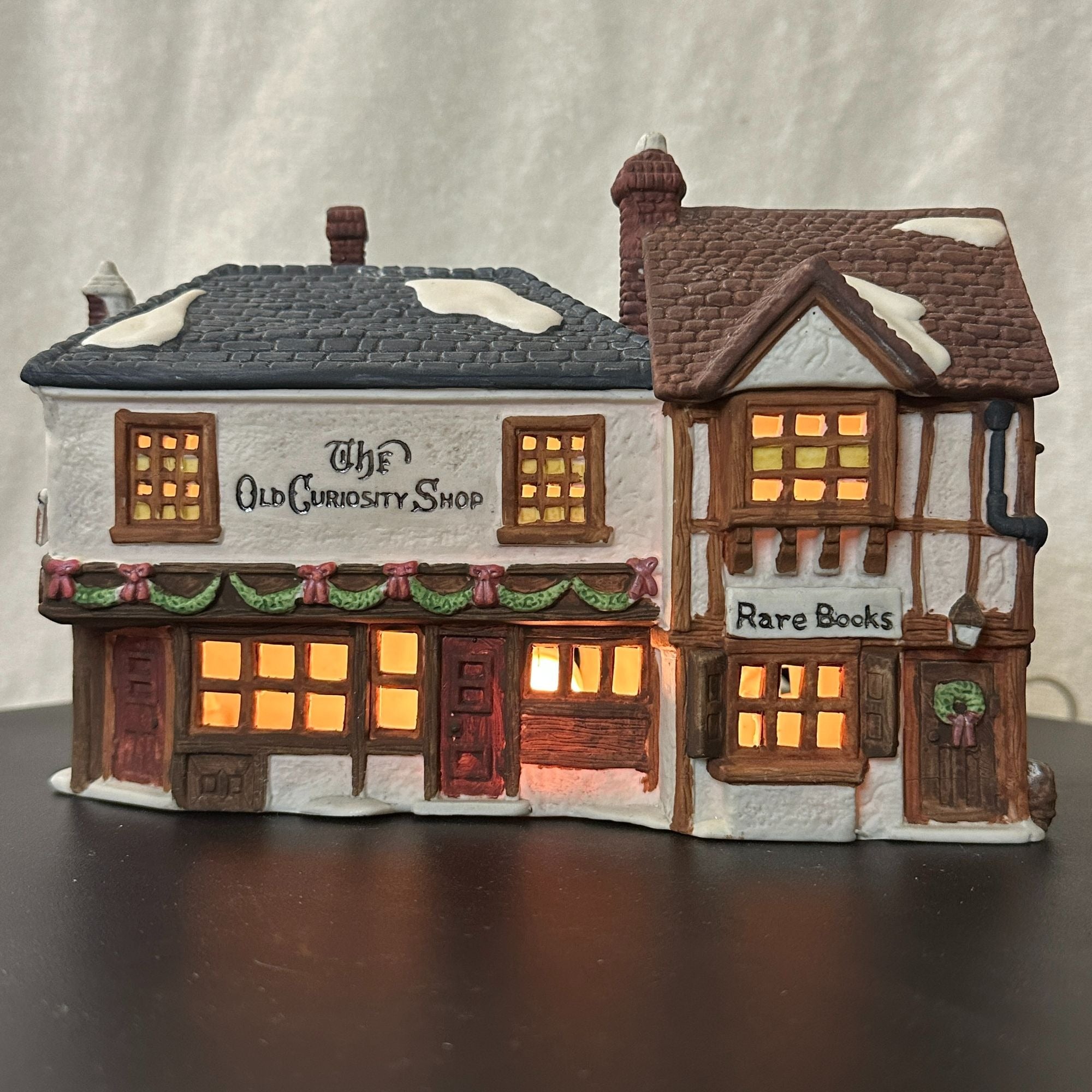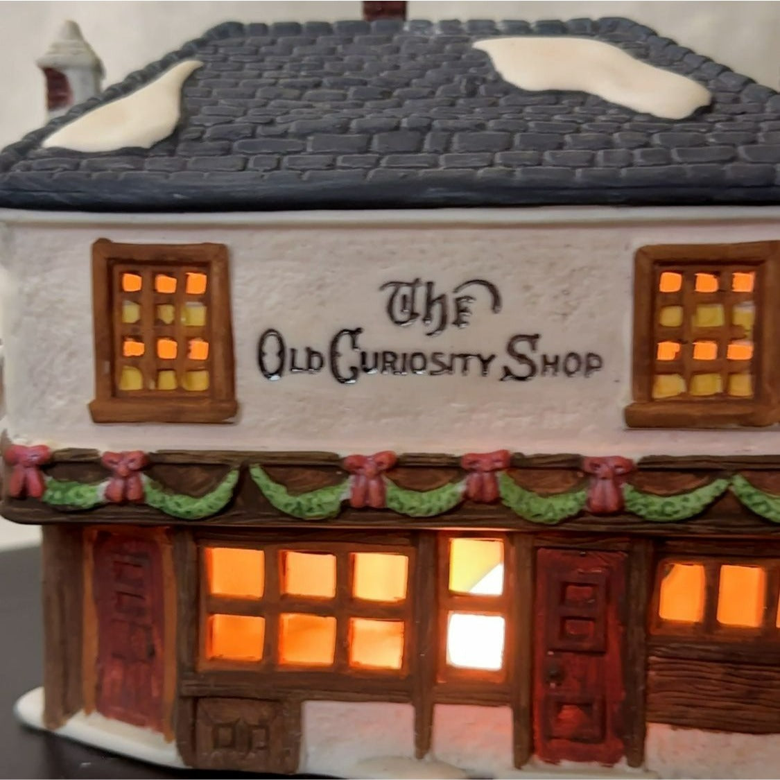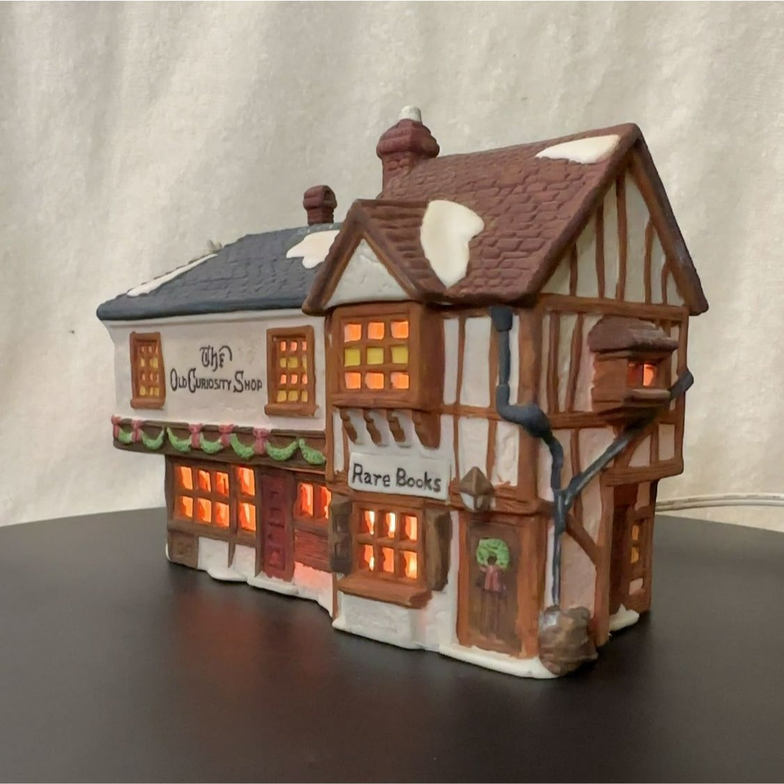 This beautiful Christmas collectible makes a classy addition to any village collection. The Old Curiosity Shop is in good condition for being over 35 years old and has beautiful artwork, color and design, each piece is properly marked on the bottom of the piece. Comes with protective case and sleeve (sleeve has wear) and light cord.