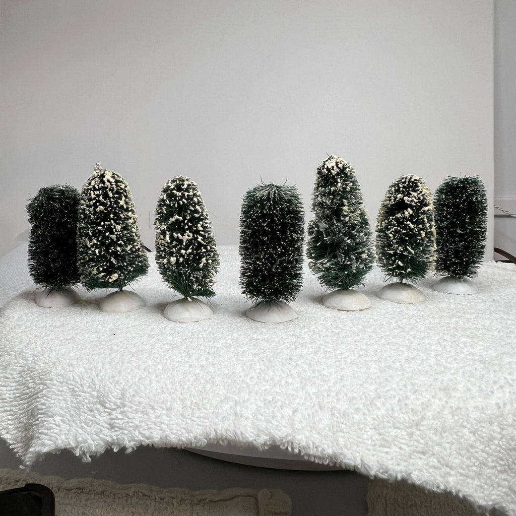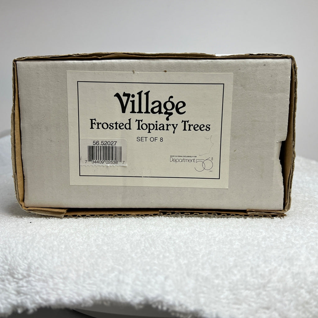Department 56 Village Topiary Trees, general village accessory crafted in 1989, this set of seven frosted topiary trees adds a classic touch to holiday displays or model village setups, blending elegance with nostalgia.