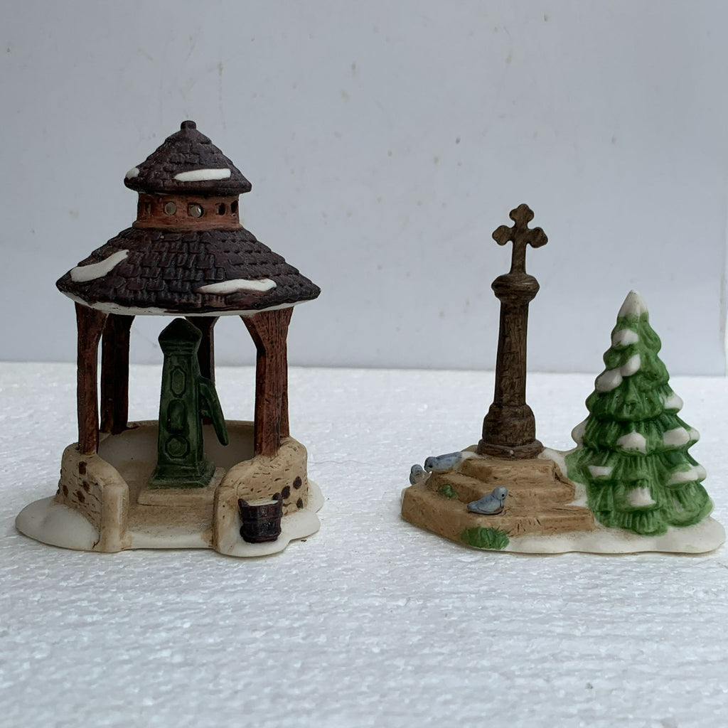 Deck the halls with Department 56's enchanting Christmas magic with the Village Well & Holy Cross, Dickens Christmas Village accessory set of 2 from 1987. Old fashioned hand pump used for water housed in small gazebo. Cross upon pedestal on stone step base. Mint condition pieces Size: 3.25" x 3.5"; 3.25" x 4"