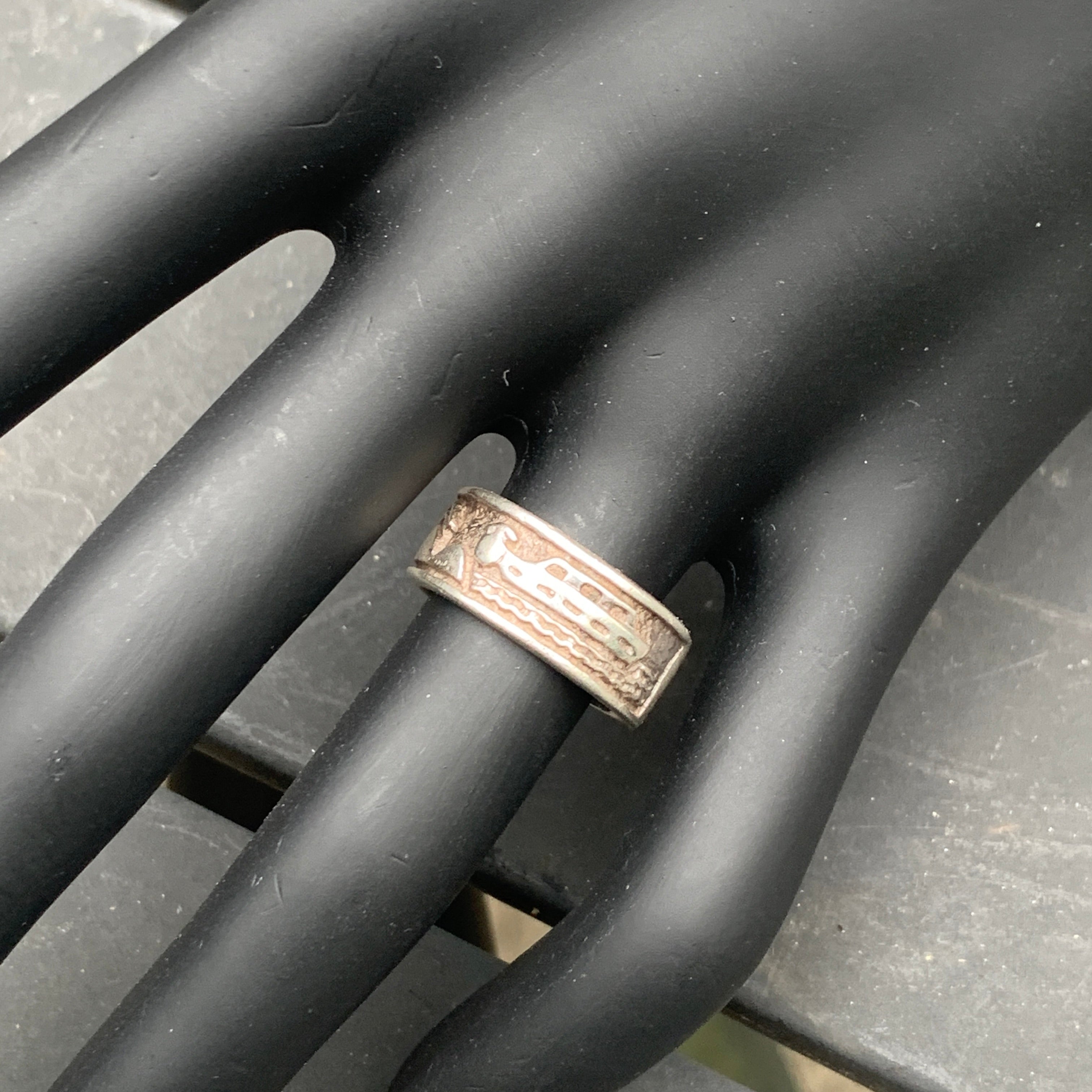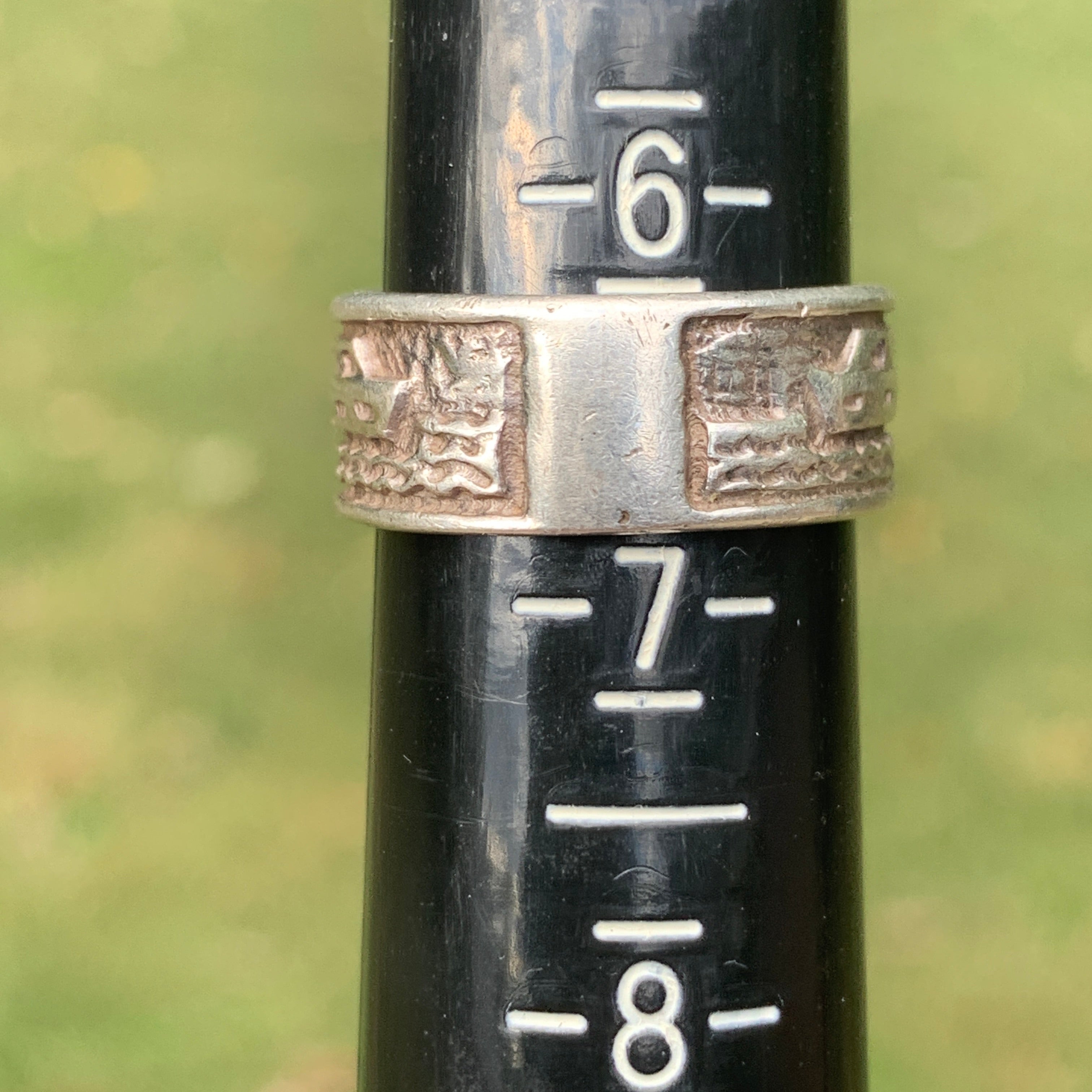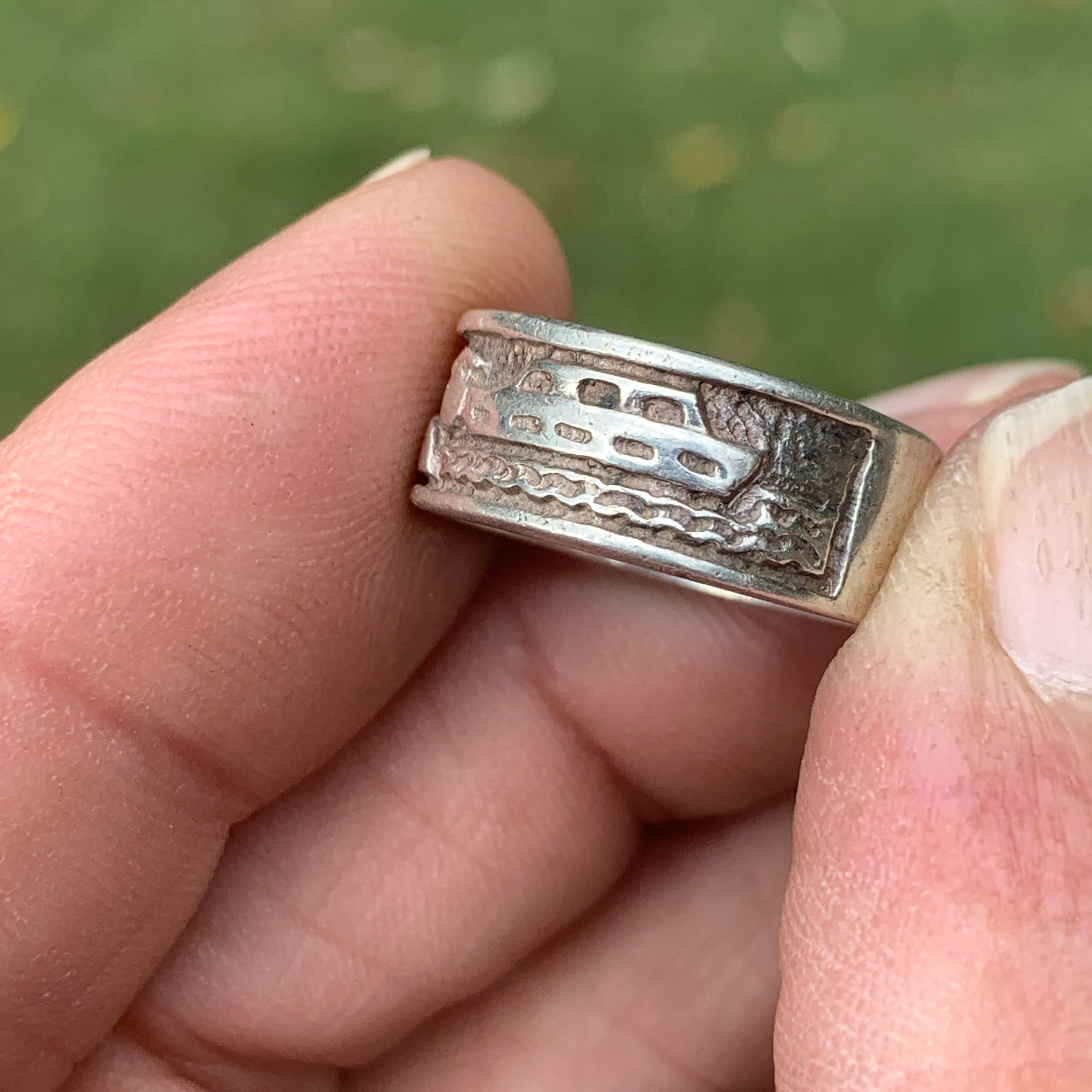 Older silver ring in size 6 1/2 with silver colored figures which I believe are paddleboats and wave symbols on the face of the ring. This vintage jewelry is uniquely designed and is a pretty sharp looking ring from yesteryear.