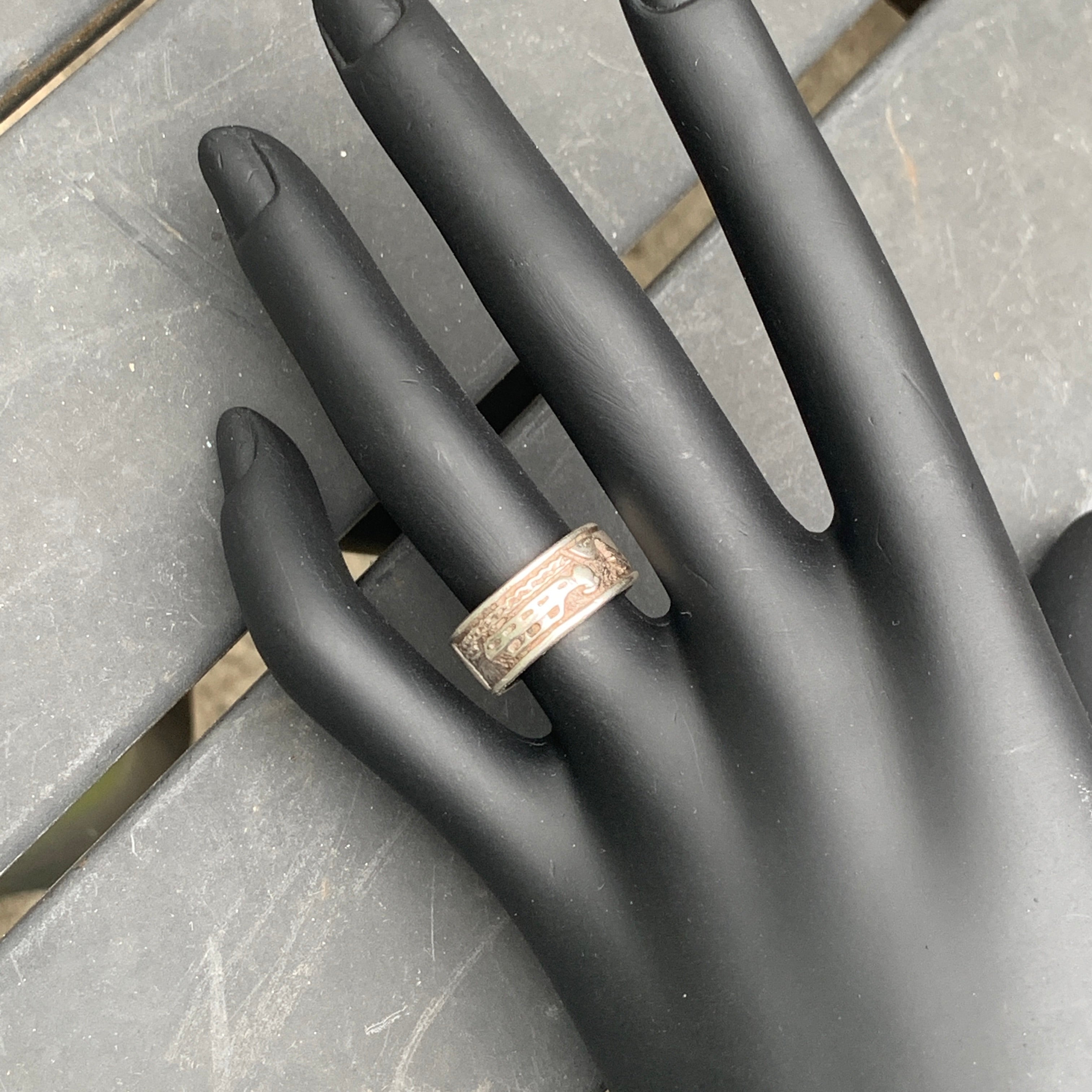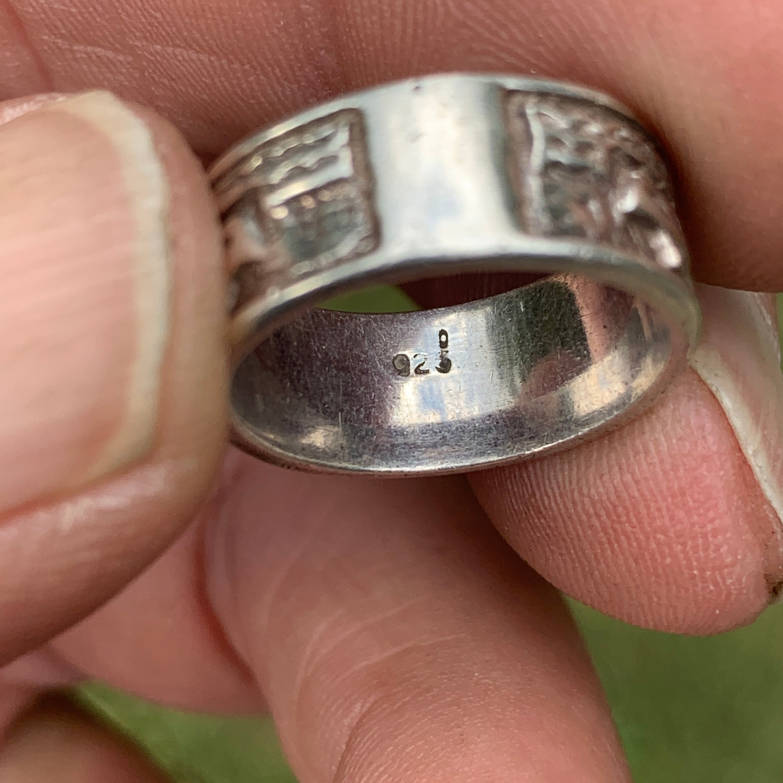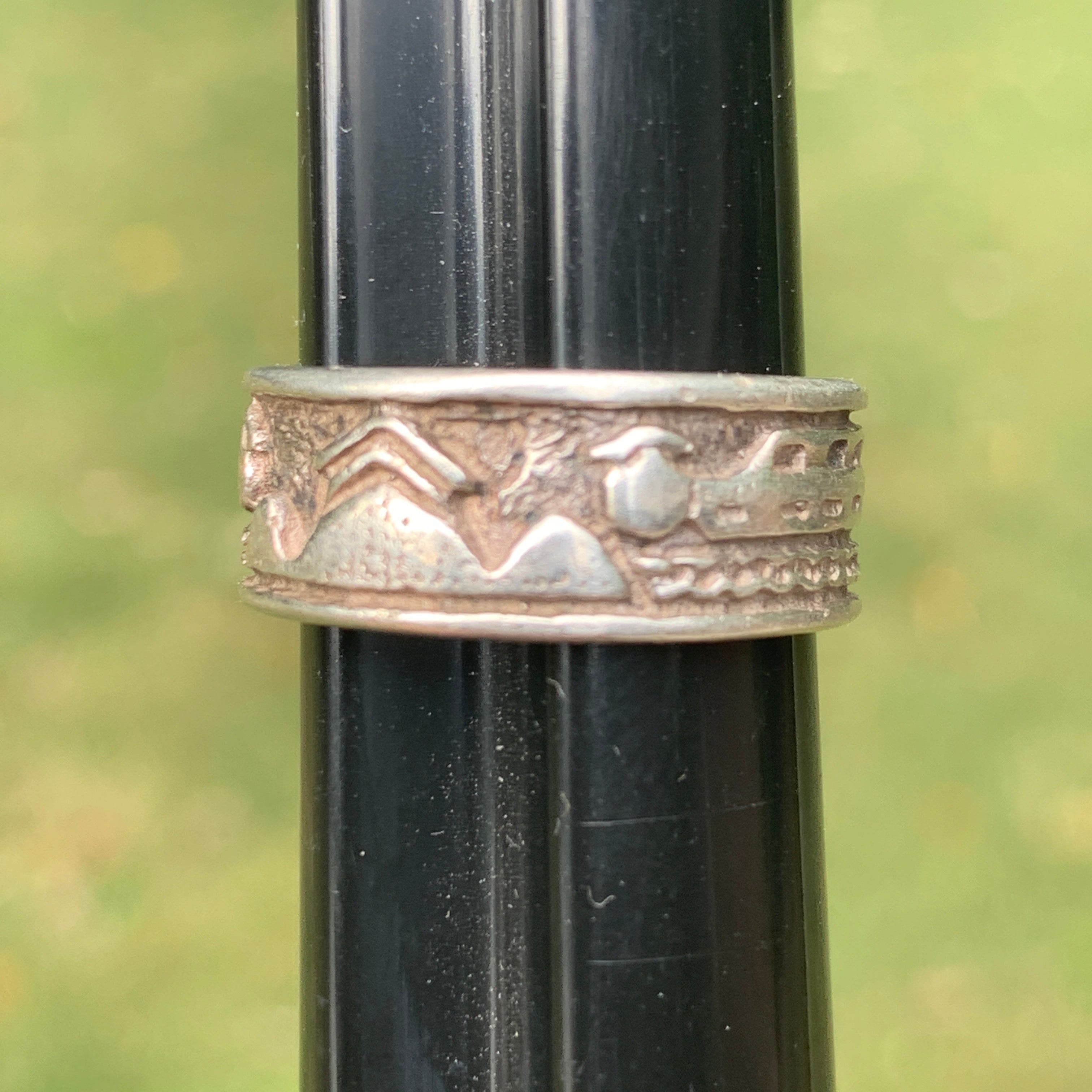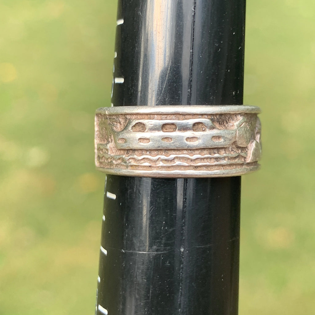Older silver ring in size 6 1/2 with silver colored figures which I believe are paddleboats and wave symbols on the face of the ring. This vintage jewelry is uniquely designed and is a pretty sharp looking ring from yesteryear.