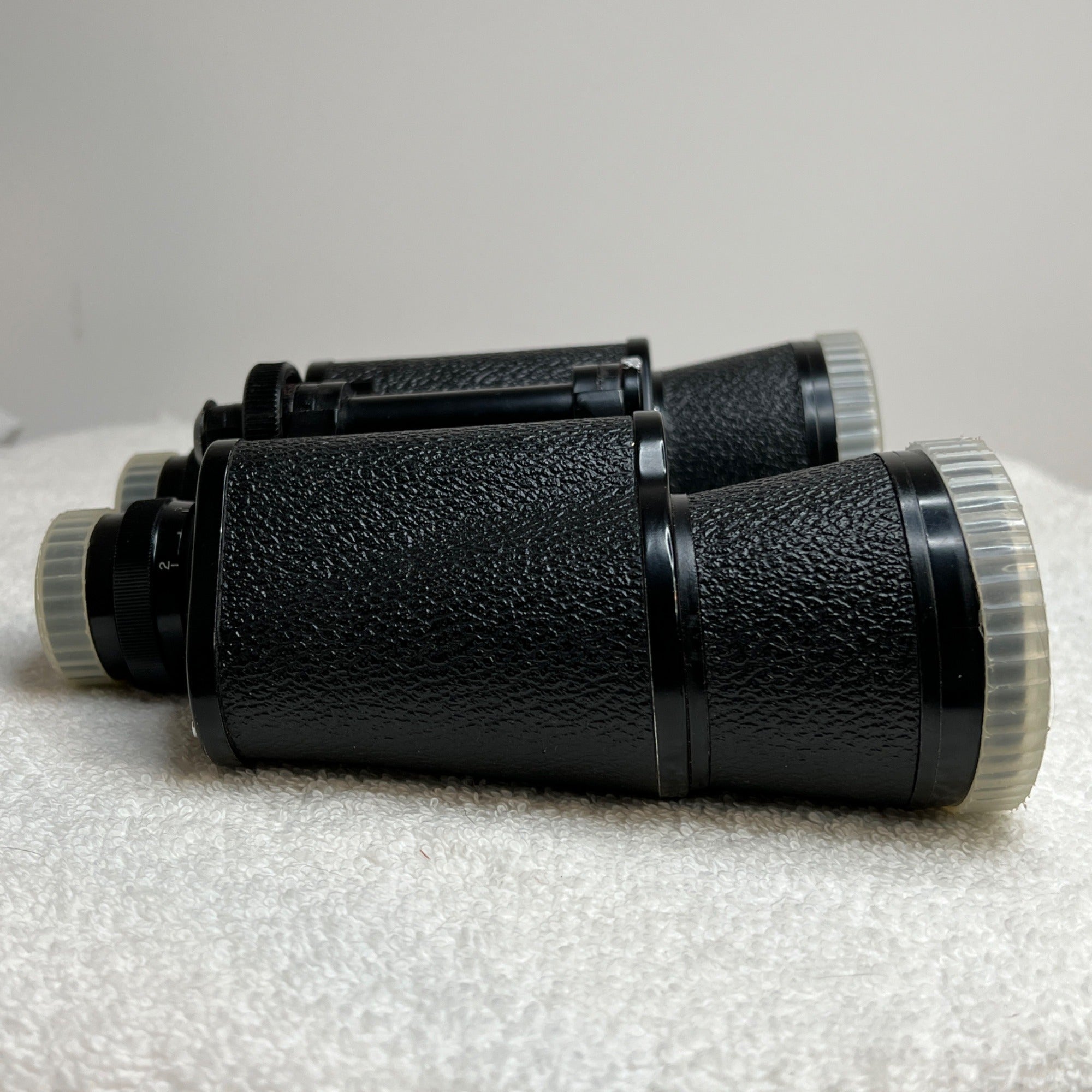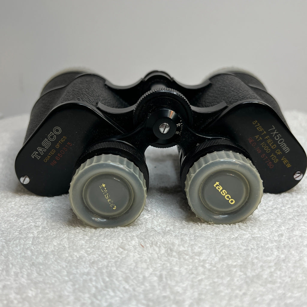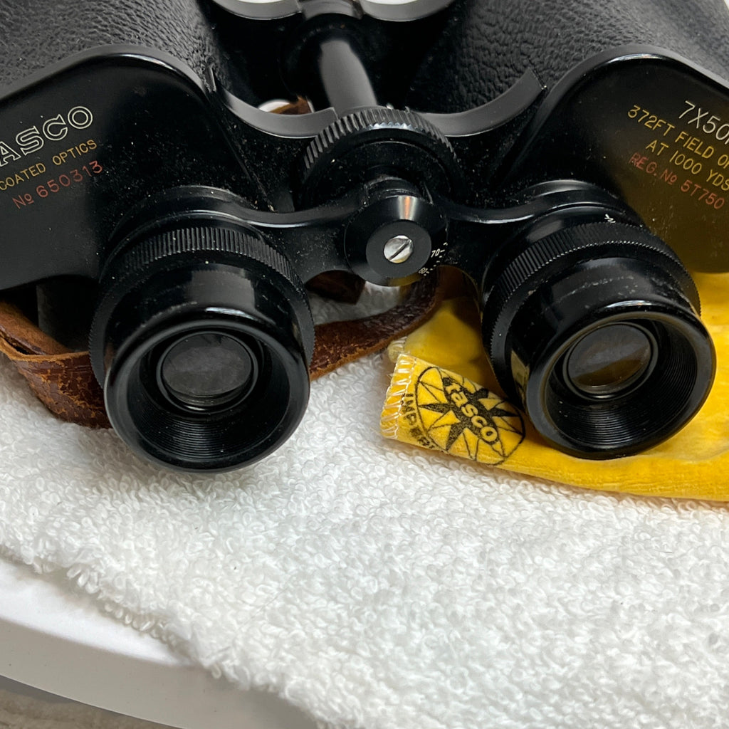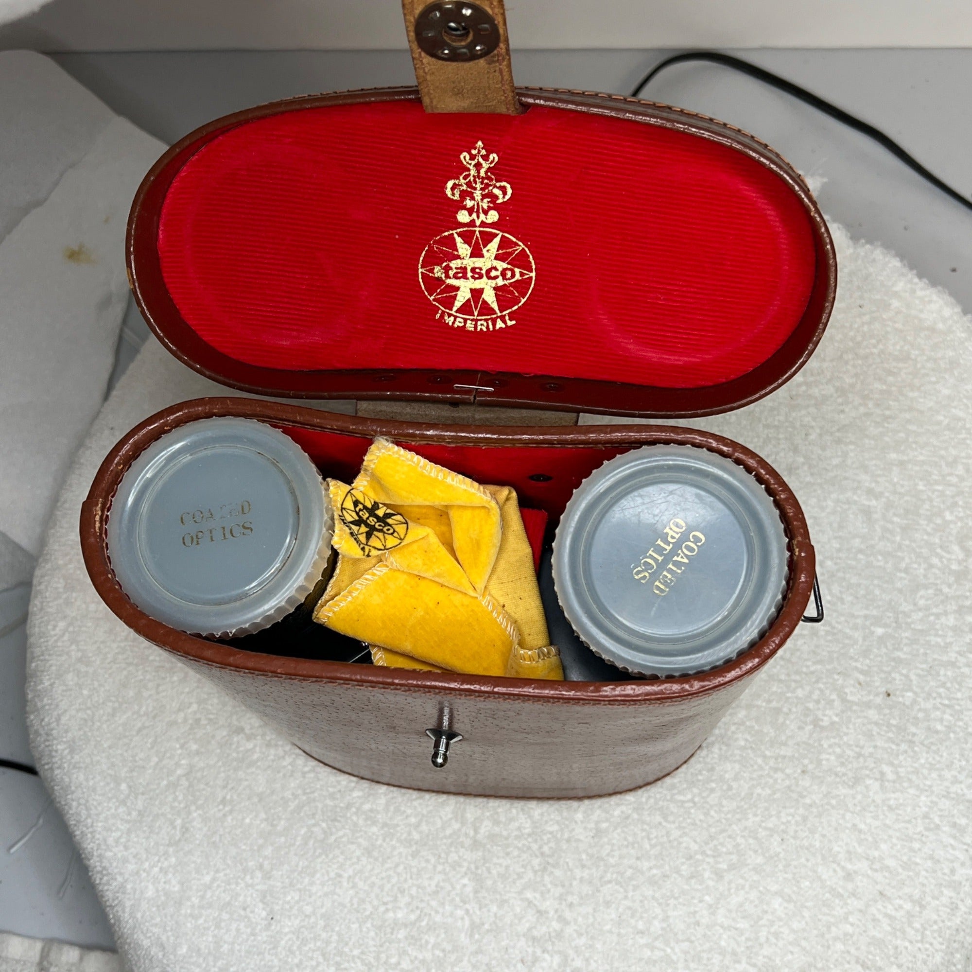 Vintage Tasco Imperial Binoculars 7x50mm With original collectible case, all lens caps are included along with a cleaning cloth, the lenses are clear. The focus adjustment center knob on these binoculars is very tight from non-use over the years and should loosen up with use or oiling, and there is some paint scuffing on the metal body in the center between the lenses (see pictures). The case still holds the binoculars well and does latch close. The leather straps are really worn and probably not useable but the will come with the binoculars.