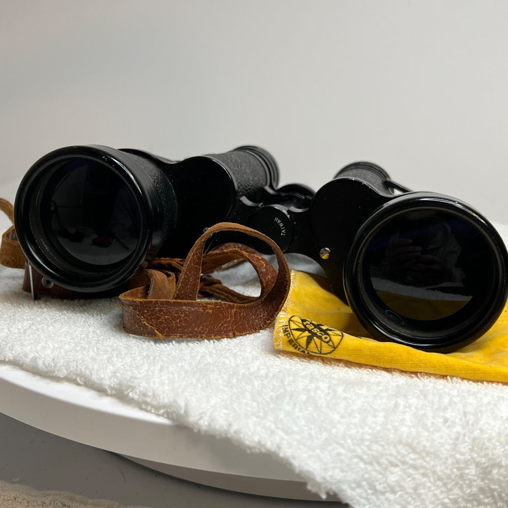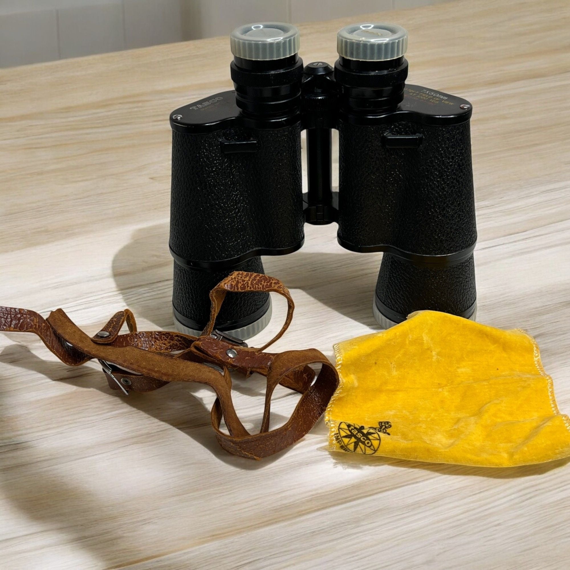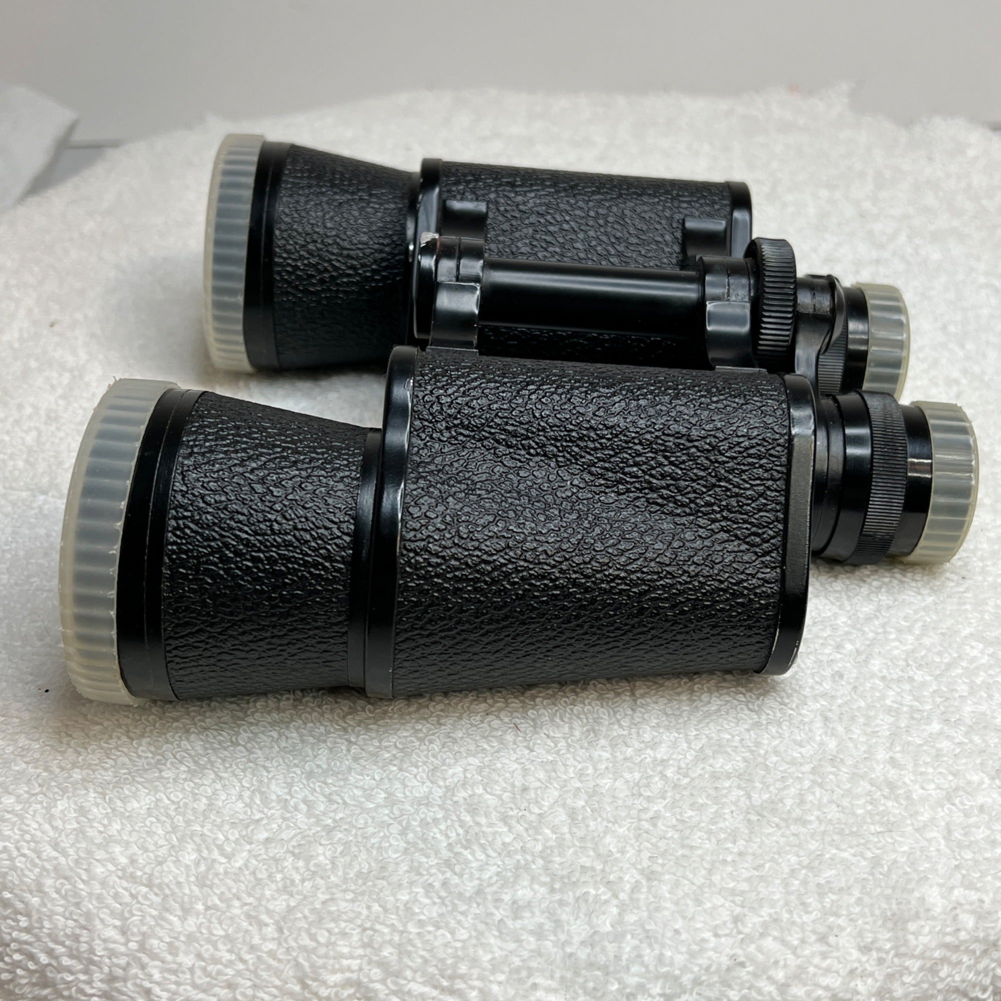 Vintage Tasco Imperial Binoculars 7x50mm With original collectible case, all lens caps are included along with a cleaning cloth, the lenses are clear. The focus adjustment center knob on these binoculars is very tight from non-use over the years and should loosen up with use or oiling, and there is some paint scuffing on the metal body in the center between the lenses (see pictures). The case still holds the binoculars well and does latch close. The leather straps are really worn and probably not useable but the will come with the binoculars.