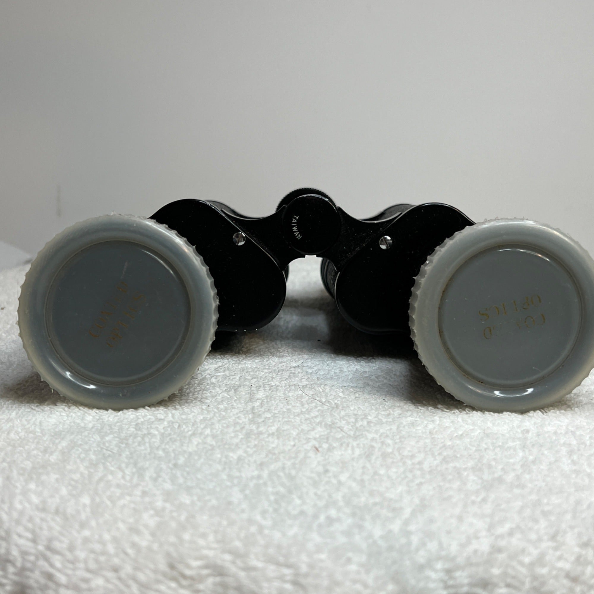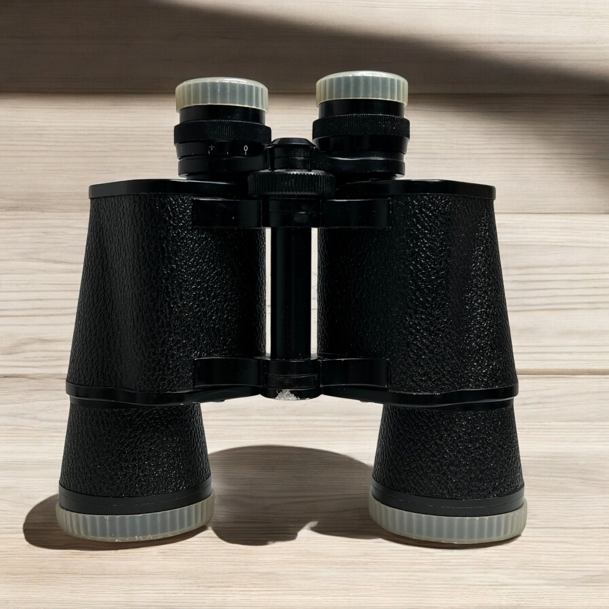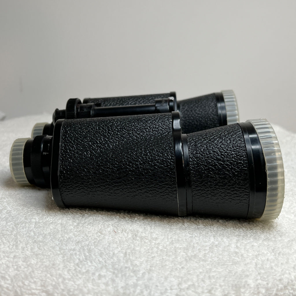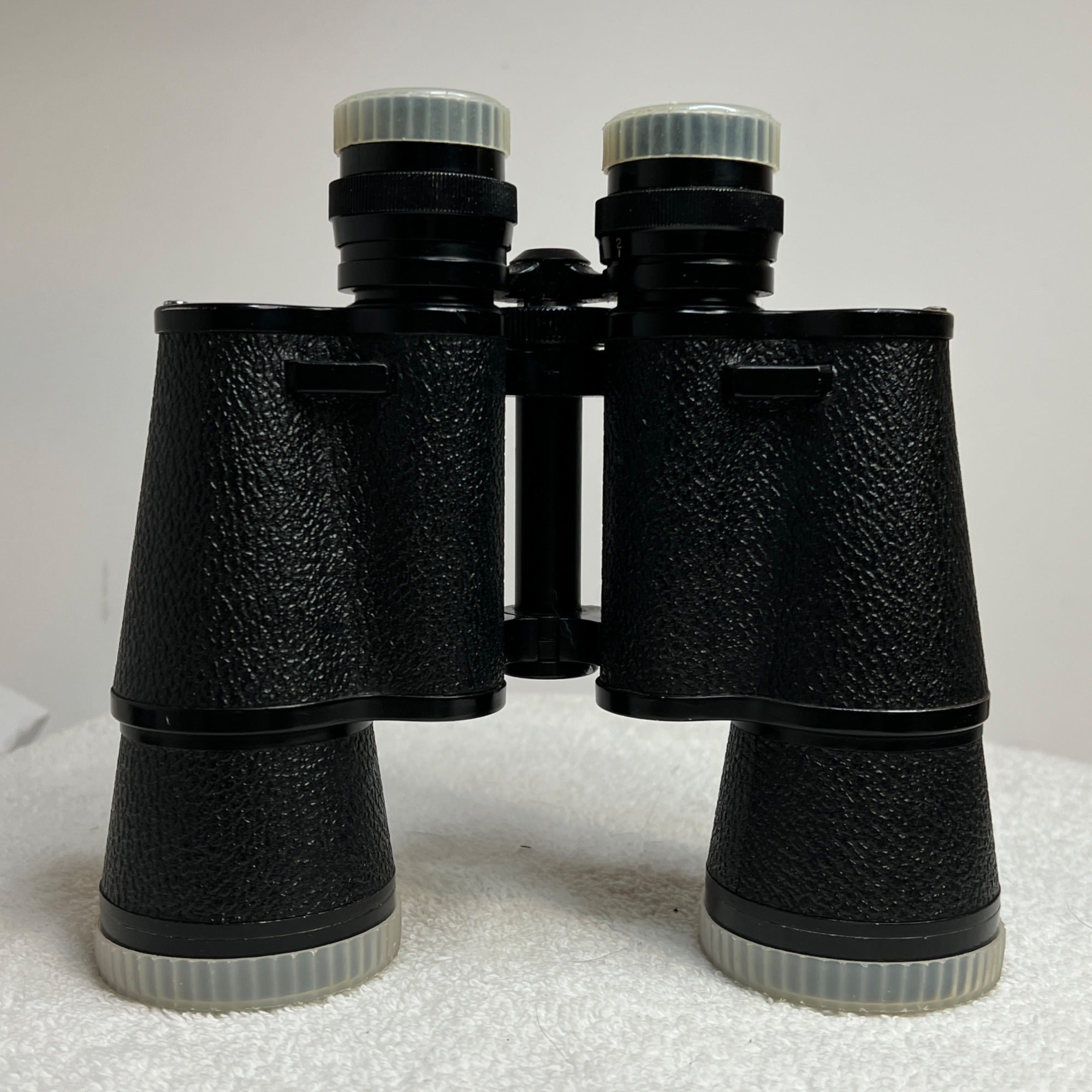 Vintage Tasco Imperial Binoculars 7x50mm With original collectible case, all lens caps are included along with a cleaning cloth, the lenses are clear. The focus adjustment center knob on these binoculars is very tight from non-use over the years and should loosen up with use or oiling, and there is some paint scuffing on the metal body in the center between the lenses (see pictures). The case still holds the binoculars well and does latch close. The leather straps are really worn and probably not useable but the will come with the binoculars.